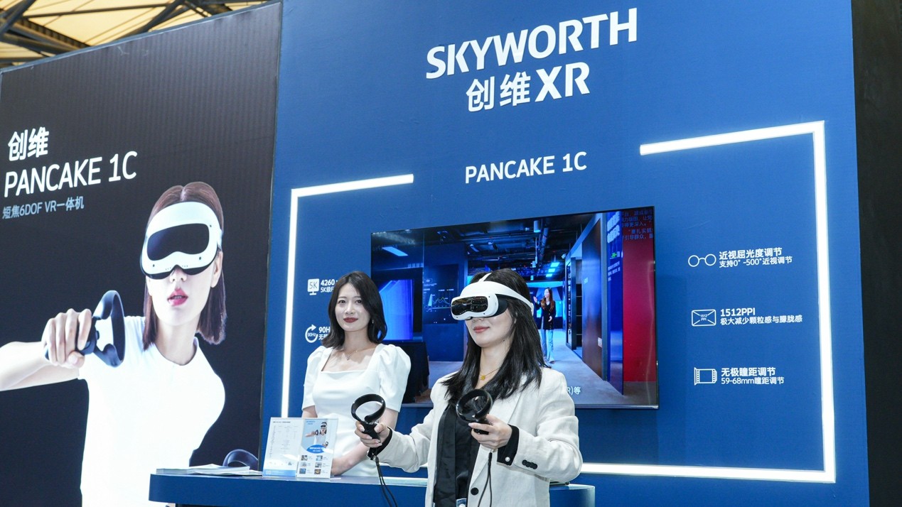 同样首次参展的还有创维XR,共展出两款产品PANCAKE 1C VR一体机和AR眼镜 。其中,PANCAKE 1C VR一体机,此机型为全球首款消费级短焦VR一体机,具有超薄机身,整机重量436g(主机重量189g),机身厚32mm,佩戴舒适度大为升级;同时自研的6DOF追踪定位+高通骁龙XR2的顶级配置,使得主流VR经典大作都能提供丝滑流畅的运行体验。在VR领域,创维聚焦硬件与内容双轮驱动,产品在重量、分辨率、结构、便捷度、舒适度等多款指标上取得突破,并开创了3D 180度VR才艺互动直播,开启直播新时代。一同展出的创维AR眼镜,重量仅69g,虚拟成像6m173寸,视场角40°,可以连接手机进行观影,还可以连接游戏机如Switch进行玩游戏,以及在B端商业应用领域进行办公等。