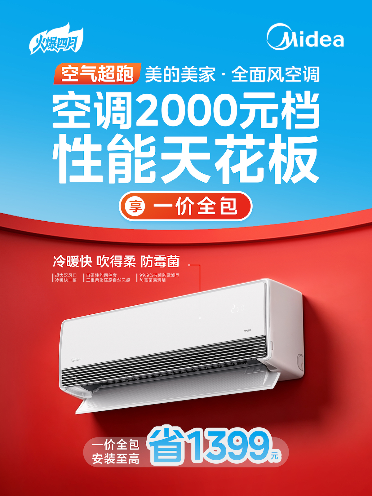 产品好,价格省,安装快,服务佳!美的空调春装季大促已经全面打响,从4月1日至5月5日,这场福利狂欢正在火热进行中!有换新或装修需求的消费者,千万别错过这一波年度难得的政策红利!赶紧前往离您最近的美的空调门店,尽早享受清凉、健康、舒适的品质空气生活!现在不买,真的要等一年!