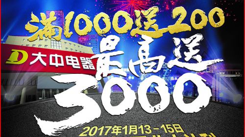 新年钟声即将敲响,大中电器精心筹备的开年大让利活动将于2016年12月30火爆开启,更有满1000送200、套购家电最高立减50%、高端家电单台5折起等一大波...