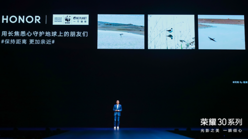 4月15日,荣耀30系列新品发布会暨2020荣耀春夏秀现场,荣耀宣布与世界自然基金会(WWF),一个地球自然基金会(OPF)建立战略伙伴关系,秉持"保...